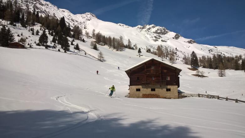 Von St. Magdalena über ein herrliches Hochtal auf die Hochkreuzspitze mit anschliessender Abfahrt über mittelsteile Hänge nach Westen.