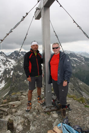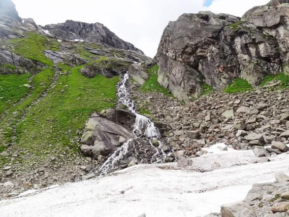 Nach der Querung des letzten hier noch vorhandenen Schneefeldes geht es wiederum sehr steil im Schotter bis kurz unter den Gipfel. Man geht dann zuerst noch rechts um den Gipfelfelsen herum und steigt die letzten 10 Meter dann in leichtere Kletterei (bis zum I. Grad) und doch etwas ausgesetzt bis zum Gipfel auf.