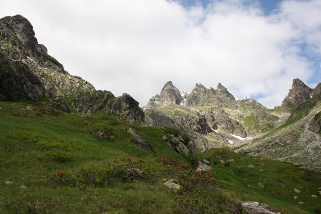 Vom Parkplatz weg kann man über die Wiese den Güterweg abkürzen und direkt aufsteigen bis man wieder auf den Weg trifft. Auf dem Güterweg geht es weiter bis zur Tafel "Tübinger Hütte". Dort zweigt man ab auf einen Wiesenweg der dann über einen kurzen steileren Anstieg hinauf führt ins Maderer Täli. Von dort aus hat man einen tollen Blick auf die urtümlich wirkenden Valgraggesspitzen und Türme. Anschließend wird es felsiger und der Weg führt in mittlerer Steilheit noch immer unschwierig hinauf bis aufs Hochmadererjoch.