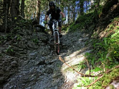 Naturbelassener Singletrail mit Stein- und Wurzelpassagen in einer wunderbaren Naturkulisse.