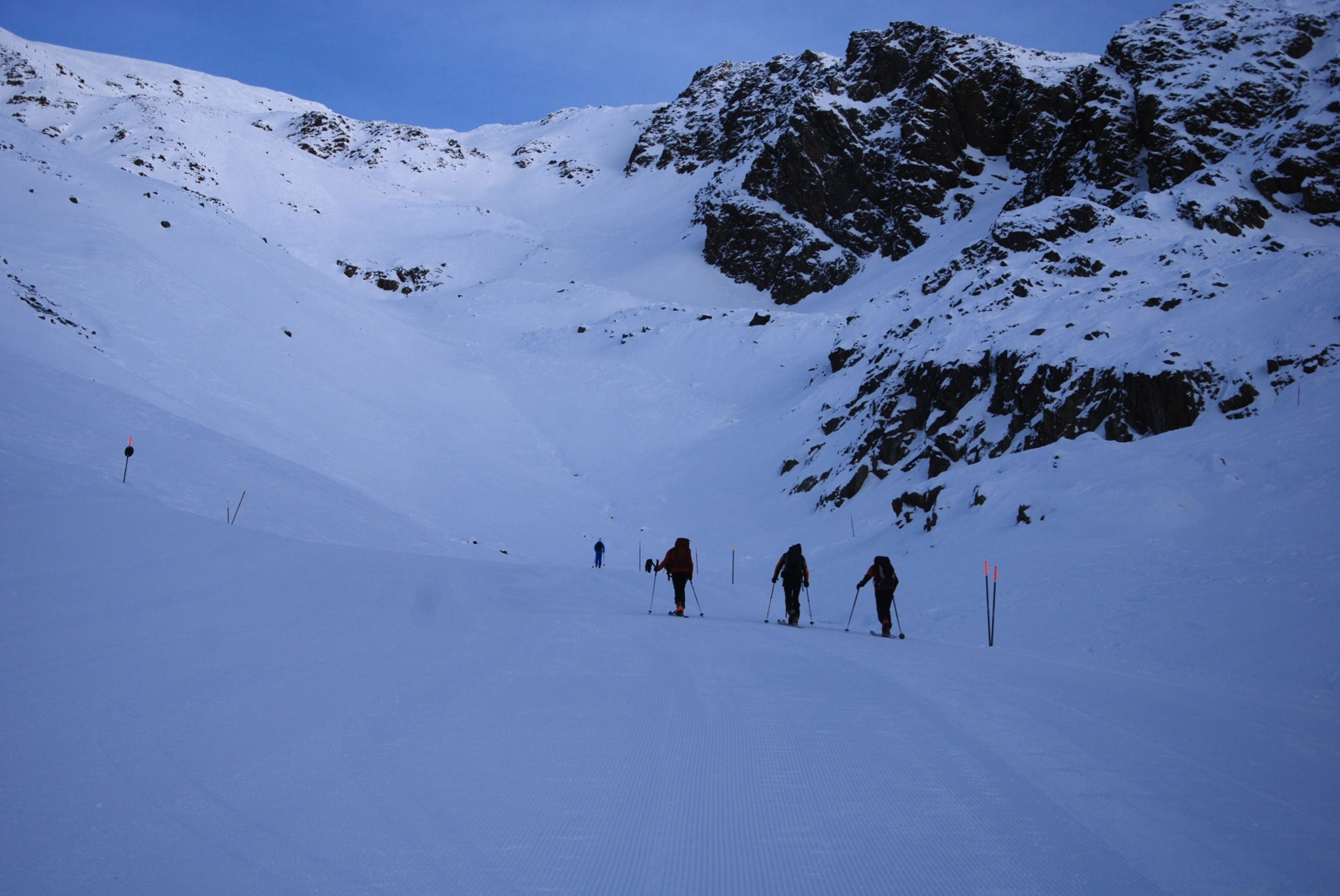 Der Aufstieg über die Pisten ist im Schnalstal grundsätzlich verboten und nur vor Aufnahme des Pistenbetriebes geduldet. Im unteren Bereich dieser Tour läßt sich aber ein Begehen der Pisten nicht vermeiden. Um Konfrontationen jeglicher Art zu vermeiden, früh aufbrechen und hintereinander am äußersten Pistenrand aufsteigen.