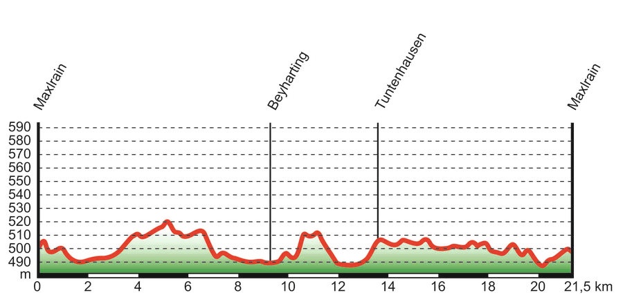 Gestartet wird am PP Maxlrain. Beginnend in Richtung Wallfahrtskirche Weihenlinden (wohin sich ein Abstecher lohnt). Dann nördlich durch den Maxlrainer Forst nach Beyharting. Über ein Waldsträßchen geht es nach Tuntenhausen. An der Wallfahrtskirche Tuntenhausen vorbei weiter über einsame Wege durch die Thanner Filze nach Schmidhausen. Durch Jakobsberg und Fischbach zurück zum Parkplatz Maxlrain. Zubringer von Bad Aibling über den Inneren Ring.