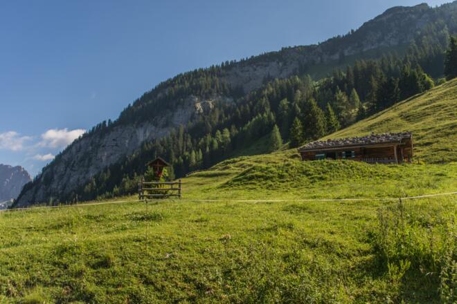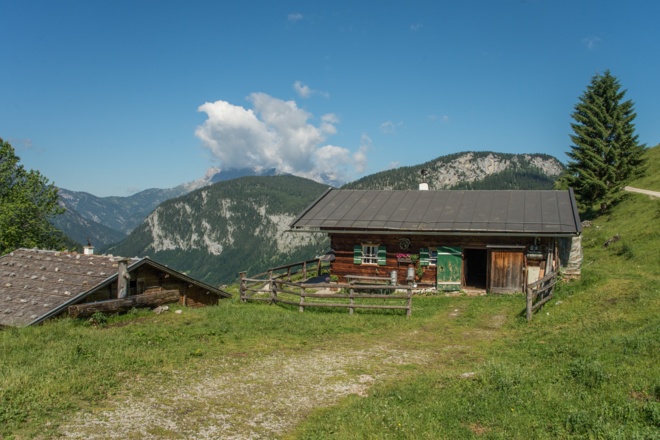 Über die Kammerlingalm (29) zum Nordalpenweg (401) über die Kaltwasserstube (kleiner Stausee) und die Weißbachalm zur Kallbrunnalm Abzweigung (Schaustadl)