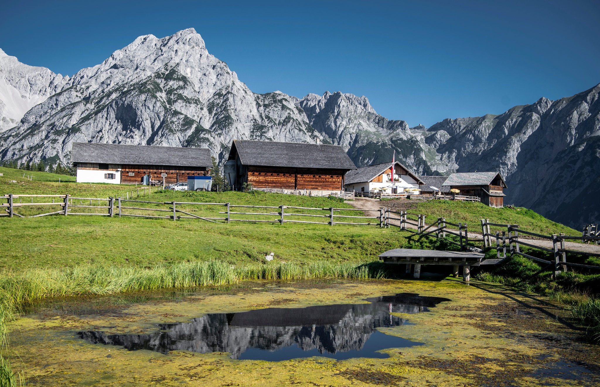 Fast eben geht es weiter zur Walderalm. Diese urige Alm mit dem Teich davor und dem Karwendel dahinter ist ein Fotomotiv wert!