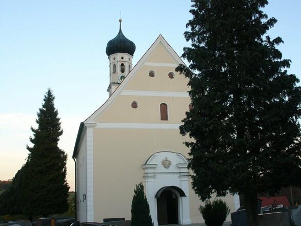 Nach Abbruch des alten Langhauses 1737 wurde das jetzige neu erbaut und die Kirche 1743 geweiht. Gegenüber der Kanzel befindet sich ein Kruzifix aus der Mitte des 18. Jh. Am Westgiebel ist das Wappen des Abtes Rogerius Friesl aus Kaisheim zu sehen. Um die Pfarrkirche ist ein Friedhof angelegt.