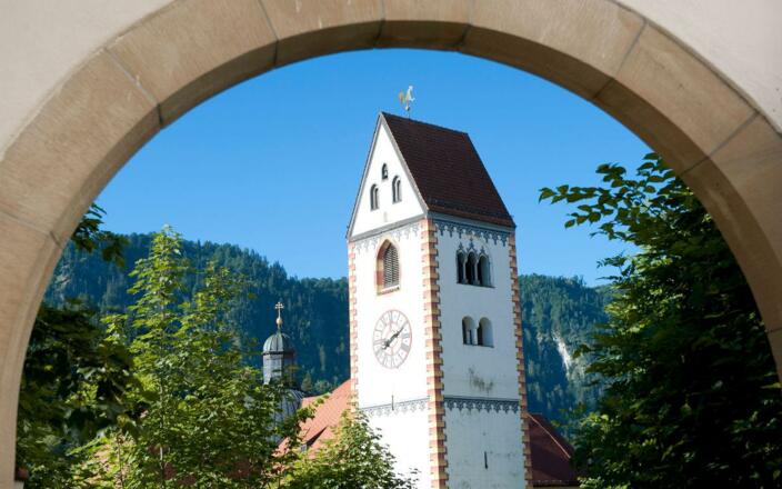 Die zu Beginn des 18. Jahrhunderts unter dem Baumeister Johann Jakob Herkomer erbaute Barockbasilika war bis 1802 Klosterkirche der gleichnamigen Benediktinerabtei. Die Innenfresken illustrieren die Magnuslegende. In der romanischen Ostkrypta ist die älteste in Bayern erhaltene Freskomalerei (um 980, Reichenauer Schule) zu sehen, die den hl. Magnus zeigt. Zu sehen in der Kirche sind italienische Einflüsse, wie das Wandpfeilerschema und ein halb römische Thermenfenster. Informationen über Führungen bekommen Sie unter www.katholisch-fuessen.de