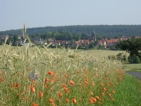 Der Wanderweg führt von der Streitberghalle an den Ortsrand von Erlenbach.