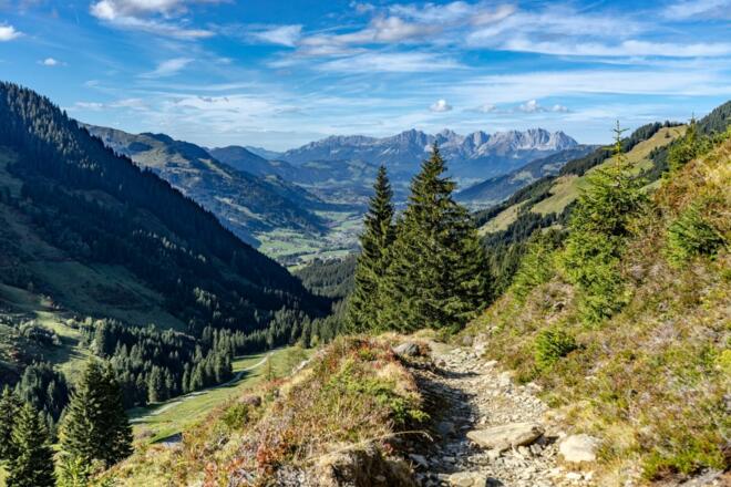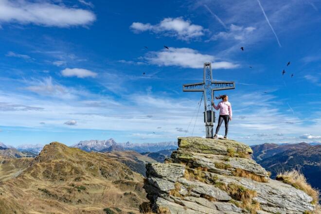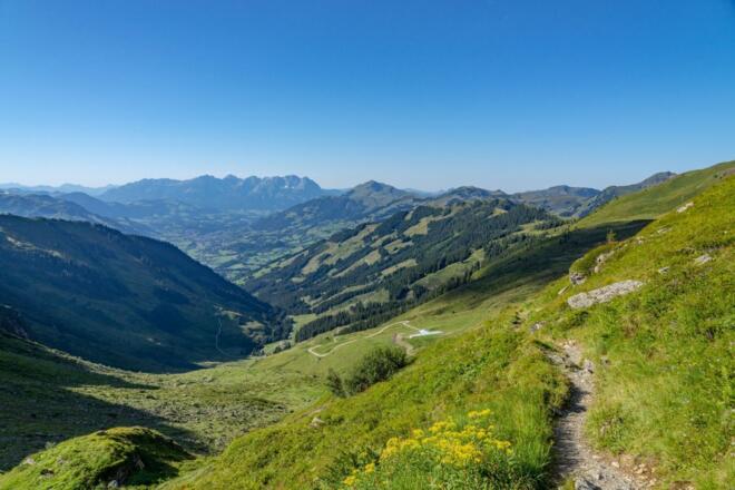 :: Von hier an zieht sich der Weg über grasiges Terrain sehr steil zum letzten Aufschwung. Vom Ausstieg sind es nur noch wenige Gehminuten bis zum Gipfel, der mit wundervollen Ausblicken auf Hohe Tauern, Wilden Kaiser, Leoganger und Loferer Steinberge sowie den Dachstein belohnt.