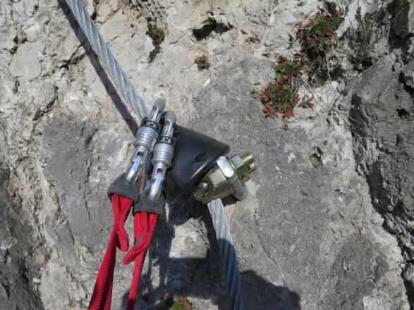 Abwechslungsreich führt nun der Weiterweg die Geierwand hinauf. Die technische Ausführung lässt keine Wünsche offen: 16 mm Drahtseil, massive Anker, zahlreiche Klammern und Kunststoffhütchen in den vertikalen Passagen, die eine ungünstige Belastung der Klettersteigkarabiner verhindern. Nach ca. 2/3 des Klettersteiges erreichen wir die "Löwenbank", einen perfekten Rastplatz, um die Aussicht zu genießen. Nun wird es nochmals spannend: durch eine kurze, schattige Schlucht kommen wir zur "Inntalblick-Seilbrücke" und nach einem kurzen, senkrechten und einige Schritte sogar leicht überhängenden Abschnitt (wegen der zahlreichen Klammern aber kein Problem, nie schwieriger als C) sind wir schon fast beim Ausstieg: unterhalb der imposanten Schlusswand der Geierwand führt ein Band nach rechts (Osten) in den Wald, wo der Klettersteig endet (das Wandbuch ist hier an einem Baum befestigt).