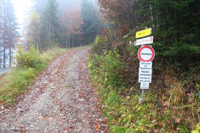 Vom Schotterparkplatz folgt man der asphaltierten Straße kurz nördlich bis ein Wegweiser nach rechts leitet. Hier steil rauf am Wanderweg.