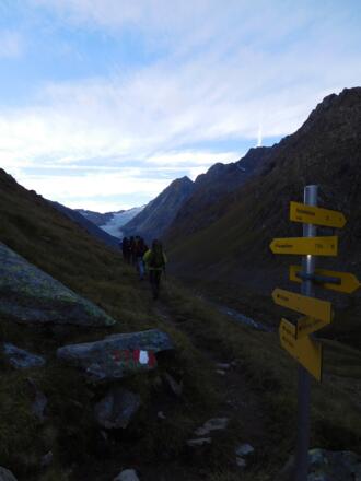 Von der Langtalereck-Hütte in Richtung Eiskögele/Seelenkogelferner (markierter Weg) nach Südosten zum Wegabzweig auf ca. 2730m (1h). Hier teilt sich der Weg in drei Richtungen auf (Schilder). Links (Nordost) geht es zum Eiskögele, nach Osten zum Seelenkogelferner. Wir gehen nach Süden in Richtung Hintere Ackerlen (siehe DAV-Karte Ötztaler Alpen - Gurgl)