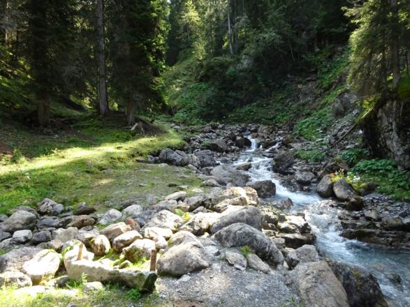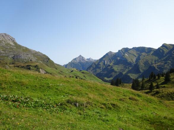 Das Berghaus Schröcken empfiehlt diesen Weg durchs Auenfeld und entlang des Lechweges nach Warth.
