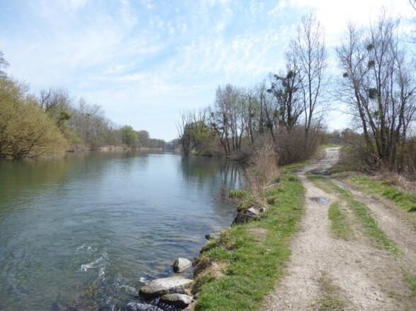 Nun kommen wir beim kleinen Weikerlsee vorbei, der heute als Badesee benützt wird. Auch hier nehmen wir den ufernahen Weg und kommen am Ende zu einer kleinen Brücke, die über den hinteren Teil des Sees führt. Hier biegen wir auf den Dammweg ab, der uns geradeaus entlang des Linzer Stadtteils Solarcity führt. Bei den Einfamilienhäusern führt ein Weg bergab in den Traunauen-Wald. Wir queren den Wald und kommen zum Hochwasserdamm auf dem ein anderer Radweg führt. Nun geht es geradeaus bis zur Brücke, dort links und noch knapp einen Kilometer gerade aus bis zur Haltestelle Ebelsberg.