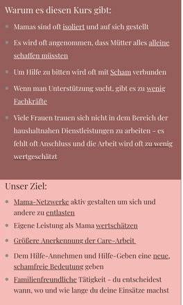 Hallo ✋ich bin jetzt 👍für Mamas da um sie zu entlasten. Das ist meine oberste Priorität. 👍Mein Ziel ist es Mamas schnell und unbürokratisch zu unterstützen und Hilfe mit ihnen für sie zu finden. 👍Meine Aufgaben gehen vom Einkauf über Kochen, Hilfe bei der Organisation des Alltags und Kinderbetreuung bis hin zum Wichtigsten:👍 Die Mutter zu umsorgen, ihr zuzuhören und für sie da zu sein. Mein Ziel ist am opitmalsten erreicht, 👍wenn die Mutter wieder in ihre Kraft finden kann. ❤️Denn Mama gut alles gut - für die Familie❤️