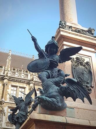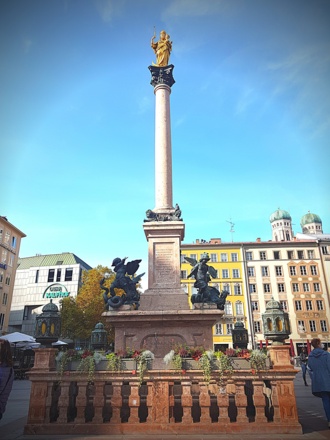 Die Mariensäule stiftete der Bayerische Kurfürst Maximilian I. Diese wurde im Jahr 1638 eingeweiht. Die Säule war ein Symbol der tiefen Dankbarkeit gegenüber der heiligen Maria für die Rettung der Städte München und Landshut vor den schwedischen Truppen in dem Dreißigjährigen Krieg sowie vor den vier Schrecken des Krieges. Die sind durch vier Ungeheuer dargestellt, gegen die die Heldenputti am Sockel der Säule kämpfen. Ein Löwe symbolisiert den Krieg, eine Schlange- die Ketzerei, ein Drachen stellt ein Hunger dar und ein Basilisk, in dem sich Hahn und Schlange vermischen, ist ein Symbol der Pest. Der Basilisk erinnert sich an eine der schlimmstem Pestwellen in den Jahren 1634 und 1635, die durch spanische Soldaten nach München gebracht worden war. Bei dieser Epidemiewelle ist ein Drittel der Stadtbevölkurung Münchens ums Leben gekommen.