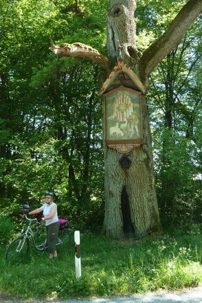 Die Wanderung startete östlich vor der Zufahrt nach Markt Einersheim bei dem Fahrweg zunächst mit Wegmarkierung "E2" Richtun Sonnenberg und dann mit "E1" bis zum Neubauhof. Dort zweigt der Weg nach links zur Ruine Speckfeld am Schlossberg ab und führt auf dem Keltenweg an der Bildeiche vorbei und hinauf zum Schwanberg.