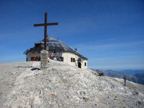 Markierungsstangen und Steinmanderl weisen die Richtung über die Übergossene Alm - gute Sichtverhältnisse sind auf diesem Hochplateau unbedingt erforderlich. Durch bizarre Felslandschaften entlang führt der ÖTK-Steig über Fels- und Geröllkuppen am Fuße des Großen Bratschenkopf (2857 m) vorbei an den Rand des Gletscherplateaus. Von hier ragt das graue Haupt des Köngis, obendrauf das Matrashaus. Aber der Schein trügt, durch das Auf und Ab des Weges dauert es noch 1½ bis 2 Stunden, bis man das Matrashaus auch tatsächlich erreicht. Der letzte Anstieg auf den Gipfel erfolgt unschwierig über eine mit Stahlseilen gut versicherte Eisenleiter. Danach steht man am Gipfel des Hochkönigs auf 2941 m, dem höchsten Punkt der Berchtesgadener Alpen.