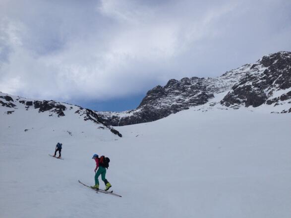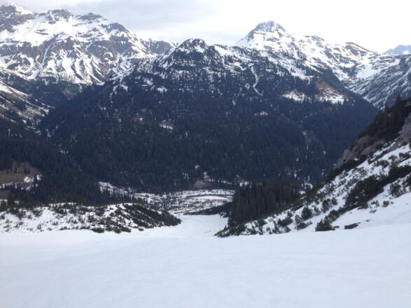 Der Langlaufloipe Richtung Formarinsee verwenden. An der linken Talseite entlang bis zum grossen Schuttkogel (natürlich schneebedeckt) den man dann Aufsteigt. Wenn man zu früh Austeigt, muss man steiles Gelände queren.