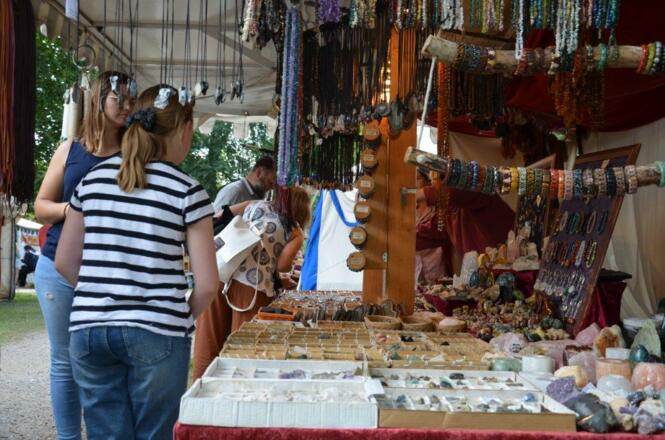 Stöbern Sie im vielfältigen historischen Warenangebot, darunter Gewandungen, Schmuck,