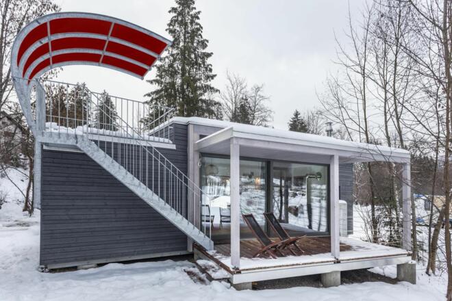 Über die Terrasse gelangt man direkt in den Wohn- und Essbereich mit moderner, offener Küche. Angrenzend auf der einen Seite befindet sich ein separates Schlafzimmer (Liegefläche 1,90m mal 1,60m), gegenüber das Badezimmer. Im Wohnzimmer ist eine zweite Schlafmöglichkeit auf der Empore vorhanden (1,80m mal 1,30m). Ermöglicht wird dies durch eine loftähnliche Deckenhöhe von fast 3 Metern – ein einmaliges Wohnerlebnis in der Natur!