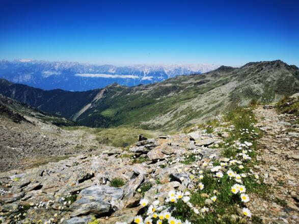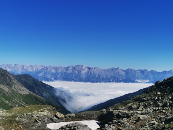 Ab der Grafmartspitze wird der Weg einfacher und es geht weiter bis zum Naviser Jöchl mit Blick in das Navistal. Wer vorher keinen Blick auf das wunderbare 360 Grad Panorama werfen konnte, welches einen entlang der gesammten Wanderung begleitet, der sollte spätestens jetzt innehalten und genießen. Vom Naviser Jöchl zieht der Weg Richtung Osten in die grüne Wattener Lizum. Ein Abstecher zum Doppelgipfel der Naviser Sonnenspitze (2.619 m) macht die 7 Gipfel perfekt.