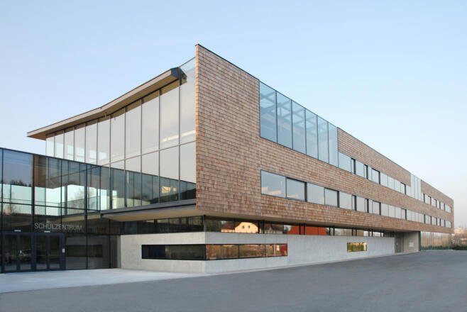 PKW und Bus-Parkplätze vor dem Bilger-Breustedt-Schulzentrum.