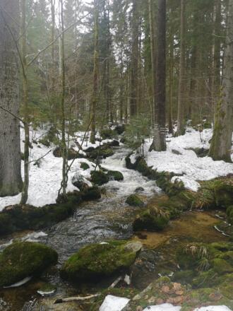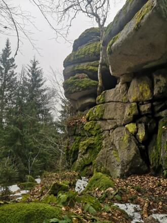 Nun geht es zwei Kilometer gemächlich durch den winterlichen Wald, mal leicht bergauf, mal leicht bergab. An einer Kreuzung nehmen wir den Weg auf der rechten Seite, Richtung Michelklause. Für diesen kleinen Pfad ist Trittsicherheit, Kondition und gutes Schuhwerk erforderlich, da der Weg durch schneereiche und matschige Stellen, direkt entlang des Baches „Schreiender Michl“ führt. Dafür ist das Panorama am rauschenden Wildbach umso schöner. Nach etwa einem halben Kilometer erreichen wir eine Lichtung und folgen weiter dem Rundwanderweg 9 zum Klausgupf. Jetzt geht es nochmal steil bergauf durch einen schönen Buchenwald. Hier sind Wegemarkierungen rar, vielleicht weil es sich um gemeindesfreies Gebiet handelt. Wir folgen einfach den Fußspuren und den gelben Markierungen der Nummer 9. Oben angekommen fühlt man sich mit den beeindruckenden Granitblöcken, die wie aufeinander gestapelt aussehen, an den Dreisessel erinnert. Die dortigen Felsformationen sind durch die sogenannte Wollsackverwitterung entstanden.