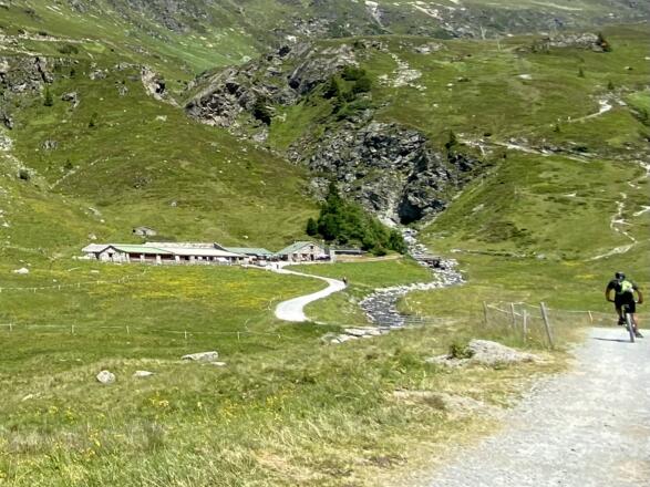 In Galtür (Enzianfeld) radeln wir gemütlich auf der für den Durchgangsverkehr gesperrten Straße zum Zeinissee. Auf der Mautstraße geht´s 1km zum Stausee Kops. Hier am Wanderparkplatz müssen wir auf gutem Asphalt steil hinunter fahren auf die Straße die von Partenen kommt und weiter auf Schotter hinauf zur Verbellaalpe. In Serpentinen geht´s hinauf und weiter das lange Tal hinter bis es echt steil größer 23% zur Heilbronner Hütte geht. Die Hütte ist hervorragend auf E-Biker (Garage, Ladestation) eingestellt.