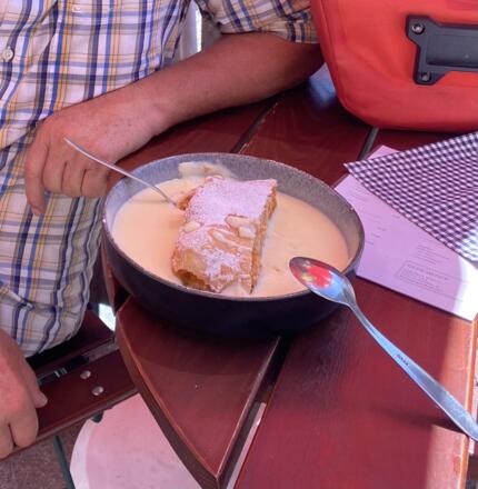 Stärkung auf der Verbellaalpe (nicht in Google zu finden) mit Radler und Speck mit Kren bevor es die Serpentinen hochgeht. Auf der neuen Heilbronner Hütte gibt´s dann noch Strudel mit Marille verfeinert.