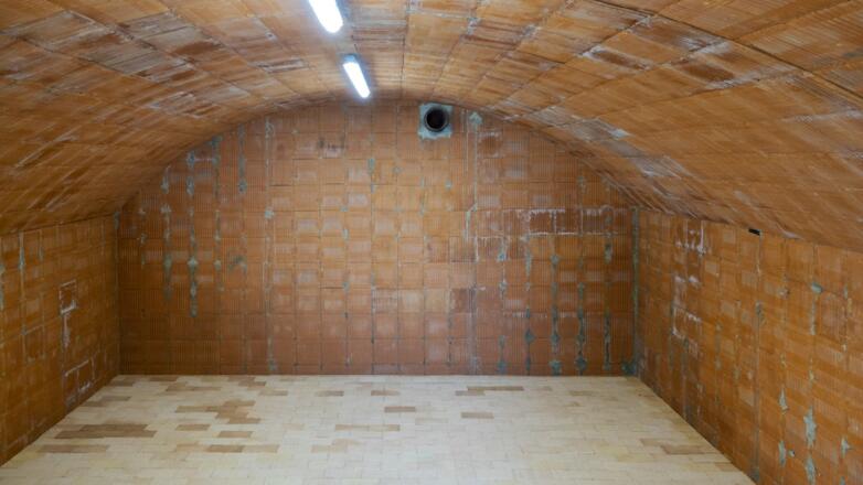 Es ist nur der Eingangsbereich sichtbar, der Rest vom Keller ist mit Erdreich überschüttet und bepflanzt.