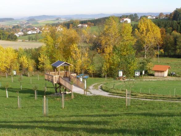 Auf einer Fläche von 2,2 Hektar findet man eine Feuchtwiese mit drei Biotopen, ein Bienenhaus, eine Blumenwiese, eine Aussichtsplattform und ca. 170 Obstbäume. Von der Aussichtsplattform hat man einen guten Überblick über die Anlage. Bei einem Rundgang durch unsere Feuchtwiesenanlage kann sehr viel Interessantes - wie Naturbiotope, ein Insektenhotel, Sumpfpflanzen, Totholzhaufen, ein Weidenhaus und ein Wasserrad - beobachtet werden.