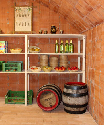 Der Eingang zum Erdkeller befindet sich rechts neben dem Infohaus. Der Keller wird zur Obstausstellung, Lagerung von Obst und Edelreiser, sowie auch für Getränke genutzt.