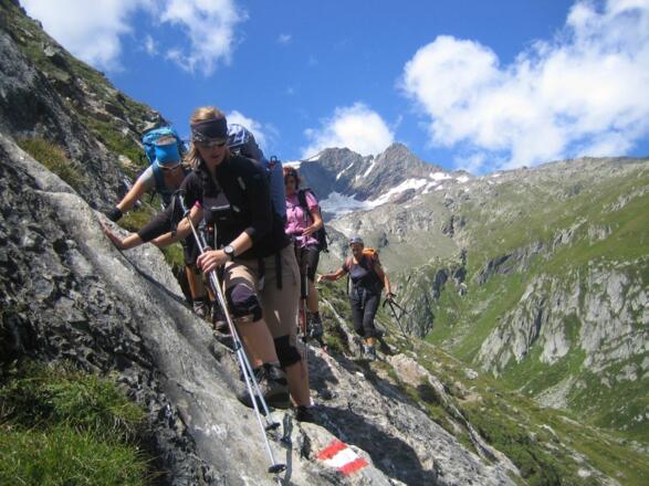Alpiner Übergang von der Clarahütte im Umbaltal zur Essener Rostocker Hütte im Maurertal. Dazwischen liegt die 2888 m hohe Hochkarscharte, der höchste Punkt der Etappe und gleichzeitig fantastischer Aussichtspunkt mit Blick auf die umliegenden vergletscherten Gipfel, allen voran den 3666 m hohen Großvenediger.