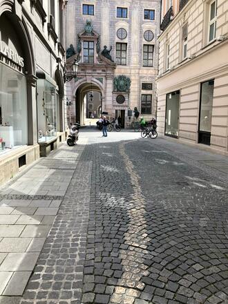 Die bekannte Feldherrnhalle am Odeonsplatz ist ein wichtiger Punkt auf allen Münchner Stadttouren. Doch hinter der Feldherrnhalle versteckt liegt die Viscardi-Gasse, die zu Zeiten des Nationalsozialismus Drückebergergasse genannt wurde. Denn auf diesem Wege konnten Münchner Widerständler den Odeonsplatz erreichen, ohne die vor der Feldherrnhalle postierten Wachen mit Hitlers Ausruf begrüßen zu müssen. Heute erinnert eine bronzene Spur aus Pflastersteinen in der Gasse symbolisch an den zivilen Widerstand gegen das NS-Regime.