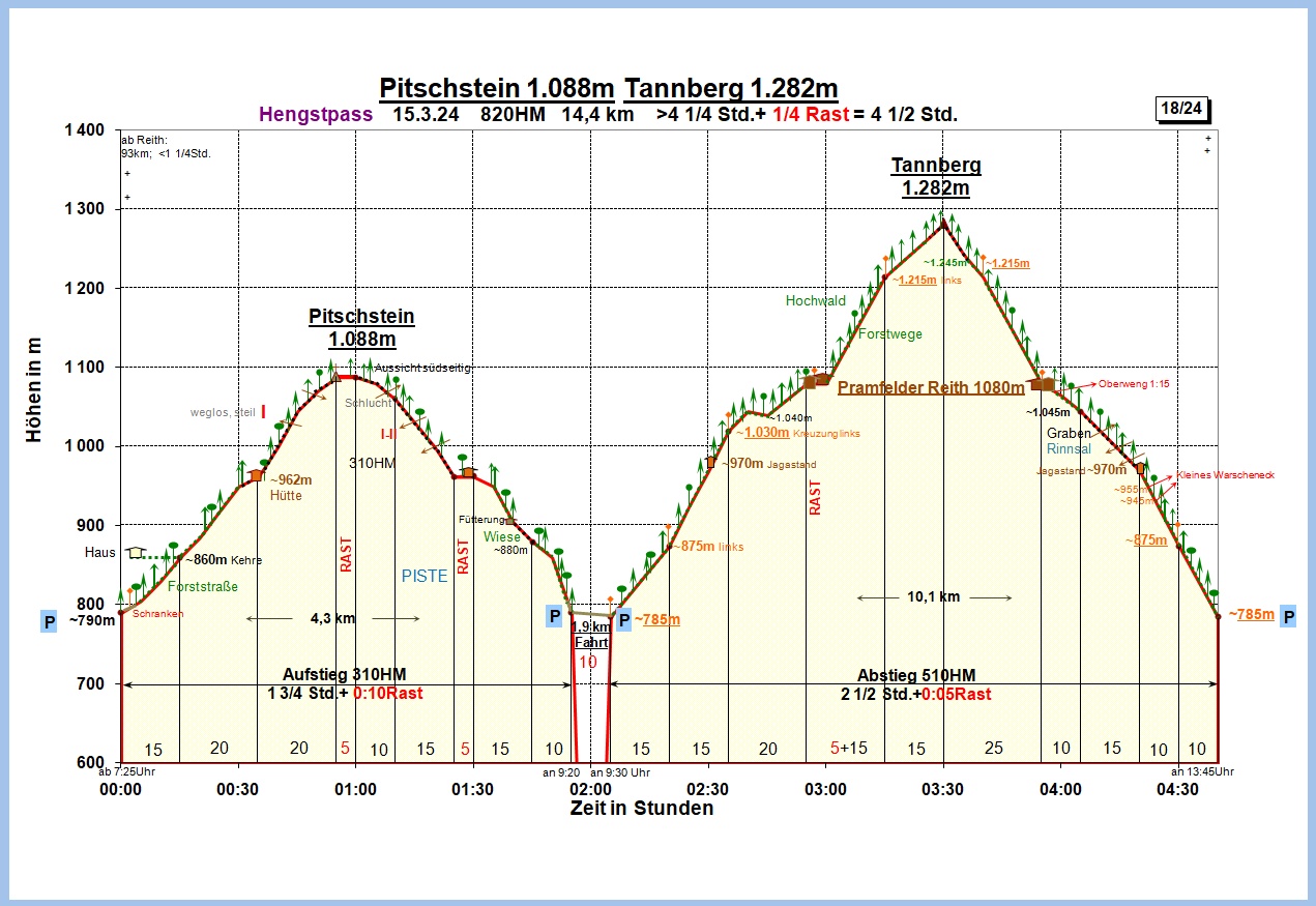 Insgesamt für beide Gipfel: 820 HM, gut 4 ¼ Std. Gehzeit bei rd. 14,4 km Wegstrecke.