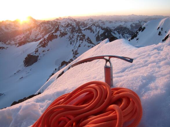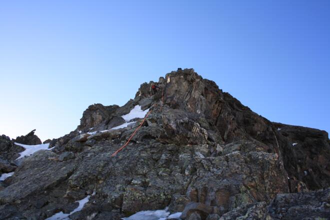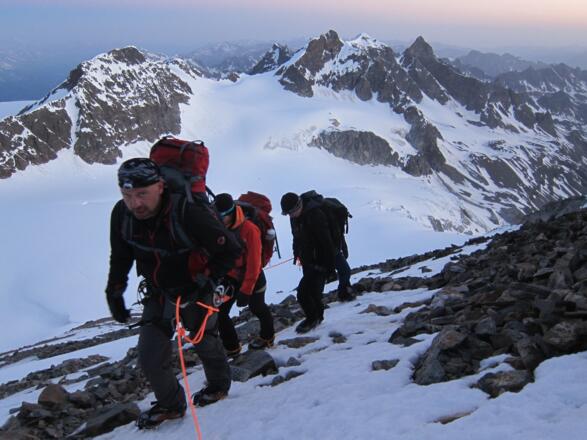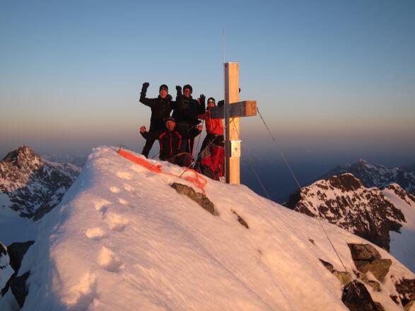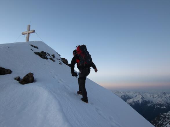 Um 03:30 Uhr war Abmarsch vom Zeltlager aus mit Stirnlampe zuerst zur Buinlücke. Die Seilschaft erreichte nach rund 50 Minuten die Lücke. Wir würden somit den Zeitbedarf von der Wiesbadener Hütte zur Buinlücke ohne Unterbrechung auf rund 3:30 Stunden schätzen, je nachdem wie die Verhältnisse sind. An der Buinlücke dann anlegen der Steigeisen. Der Gipfelanstieg führt über die recht steile Westflanke zum Nordwestgrat und über diesen durch den sogenannten Kamin (eigentlich ist es keiner) auf die normalerweise meist schuttbedeckte Westflanke (aktuell auch hier noch Schnee) und über diese dann unschwierig zum Gipfel.
