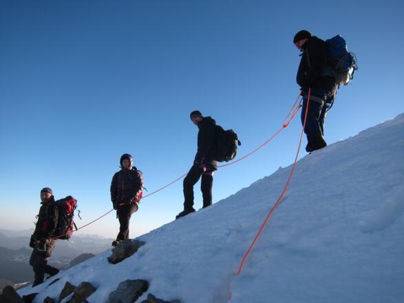In einem weiten Linksbogen geht es anschließend am Seil ziemlich steil aufwärts bevor man das Gletscherplateau erreicht welches am Ende zur Buinlücke führt. In etwa in der Mitte des Plateaus haben wir unser Zeltlager aufgeschlagen.