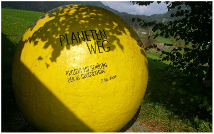 Hinter der Kirche bei der Sonne geht es los und an neun Stationen bis zum Bauernhof Welser erfährt man Wissenswertes über die Planeten unseres Sonnensystems.
