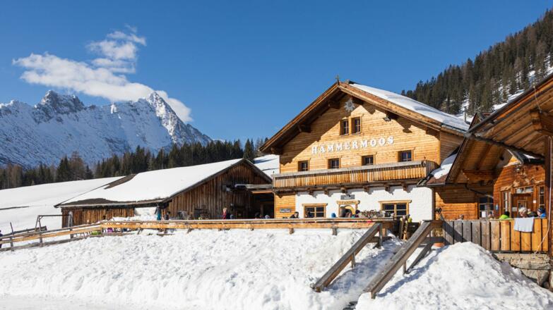 In den tief verschneiten Wintermonaten erreichen Rodelbegeisterte die malerische Hämmermoosalm auf geräumten Wanderwegen direkt vom letzten Parkplatz Salzbach (P5) im Gaistal. Der anfänger- und familienfreundliche Anstieg führt etwa 30 Minuten durch wildromantische Waldgebiete bis zur urigen Einkehrmöglichkeit auf 1417 Metern Seehöhe. Hier trifft man manchmal auch den Harfenspieler Albert, der regionale Schmankerln und dampfende Heißgetränke in der hölzernen Almhütte musikalisch wunderschön untermalt.