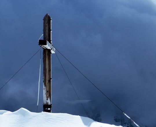 Der steile Gipfelhang erfordert sichere Scheebedingungen.
