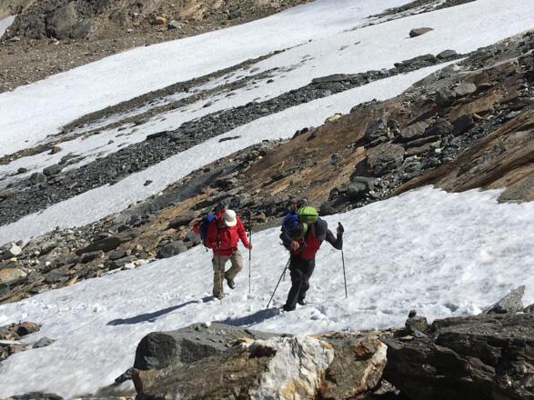 Vom Joch ist die Zwickauer Hütte gut zu erkennen. Nun über den Gletscher zur Hütte. Anseilen ist bei schneebedecktem Gletscher sinnvoll. Das letzte Stück über Blöcke und Platten ein Stück hinauf.