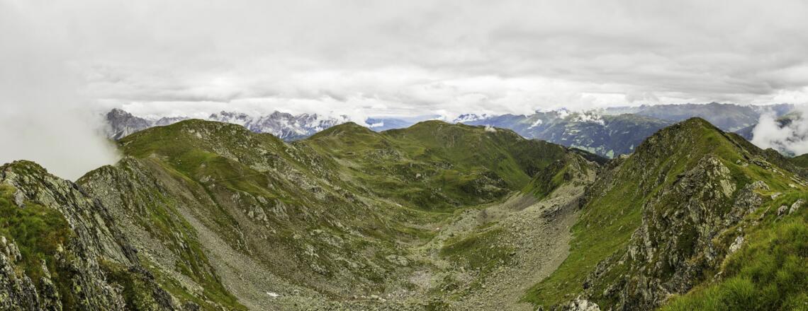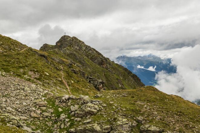 Wir steigen vom Gipfel in Richtung Osten ab und folgen den Markierungen am Grat entlang, auch wenn der Pfad anfangs kaum sichtbar ist. Es geht steil und stellenweise felsig hinab auf eine kleine Hochebene. Am Wegweiser halten wir uns links (rechts geht es zurück zum Unterstand und dem Aufstiegsweg) und wandern, leicht bergauf, hinüber zur Zenzerspitze. Unter dieser geht es auf der Westseite vorbei und über einen Kamm hinunter zu den Eggewiesen (Wegweiser). Auf dem Kamm kommt man wieder an einigen alten Befestigungs- und Grabenanlagen aus dem Ersten Weltkrieg vorbei.