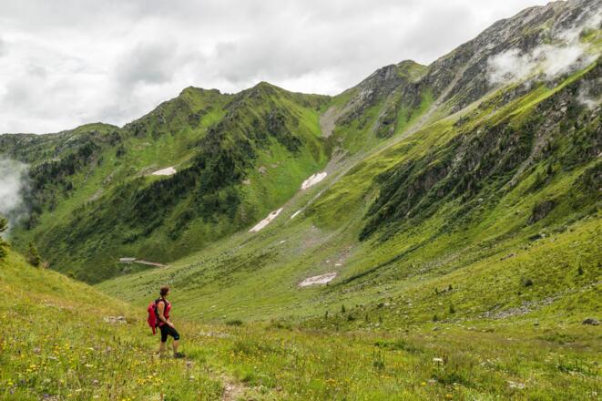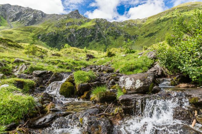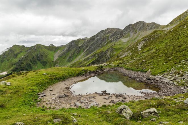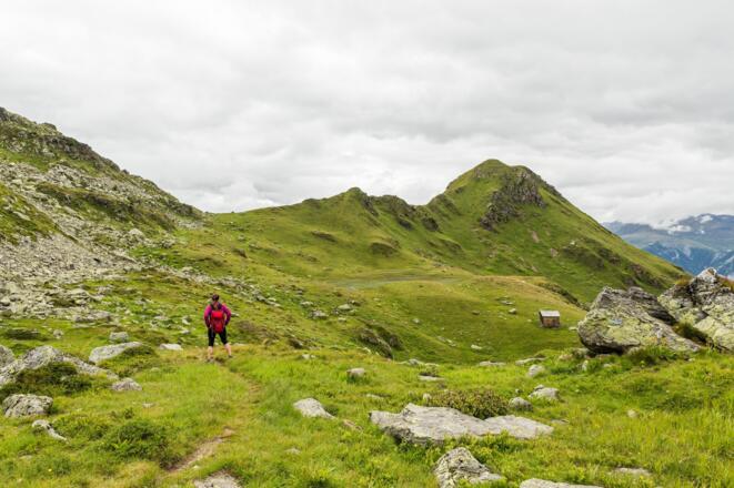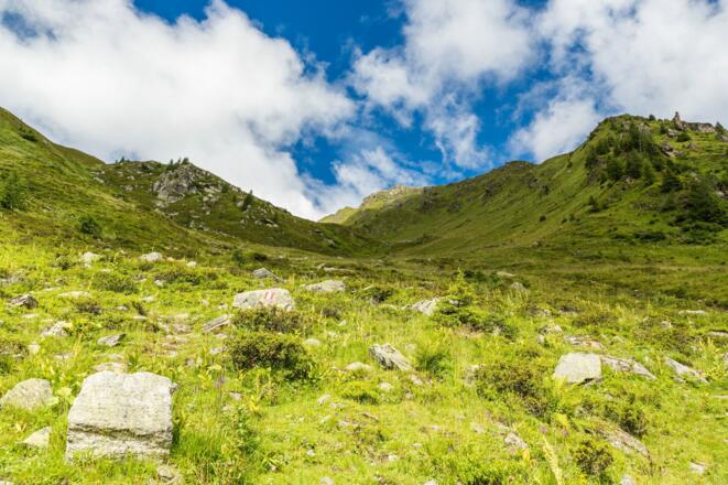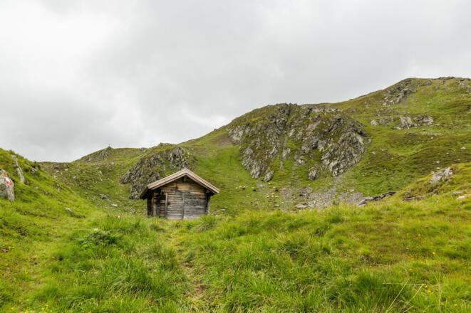 An der letzten Linkskehre zur Hütte halten wir uns rechts und folgen einem kleinen Pfad über den Ochsenboden, hinüber zum steilen Grashang, unterhalb des Hollbrucker Egg. Ab hier gibt es wieder Markierungen, die uns steil und recht direkt zu einem kleinen See und weiter zu einem Unterstand bringen.