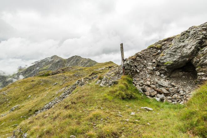 Am Unterstand folgen wir nicht der Beschilderung, sondern halten uns links (östlich) und steigen kurz hinter der Hütte einen kleinen Pfad zu einem Holzkreuz hinauf. Von dort geht es weiter über einen alten, unscheinbaren Kriegssteig hinauf zum Karnischen Höhenweg und auf diesem weiter zum Abzweiger aufs Hollbrucker Egg. Auf diesem Abschnitt kommen wir an alten Stellungen und kaum noch sichtbaren Gräben vorbei.
