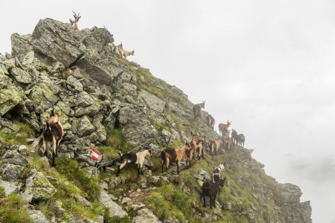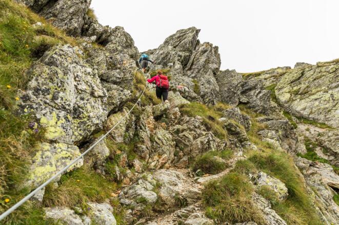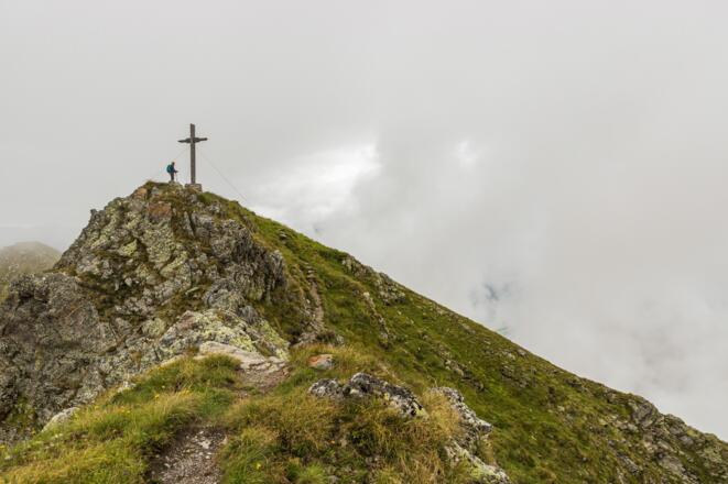 Das letzte Stück zum Gipfel führt über einen Grat und ist stellenweise mit Drahtseil gesichert. Der Weg führt stellenweise über, im Sommer bewirtschaftete Almen (Achtung Kühe).