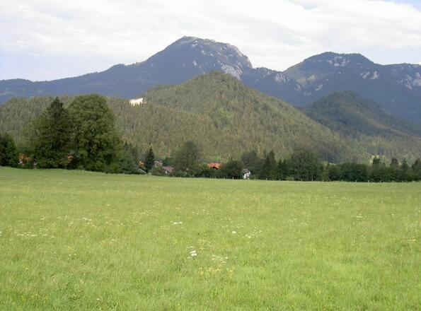 hinab. Südlich Richtung Oberachau zu neuerlicher Wegverzweigung. Hier wiederum nicht rechts (Fischbachau), sondern links abbiegen und auf einem Sandweg über den Hang hinauf (Ww. "Hundham, Elbach"). Der unbefestigte Weg mündet in eine Straße. Nach einigen Häusern Ww., nicht rechts nach Elbach weiter, sondern links abbiegen (Ww. Hundham, Wörnsmühl").