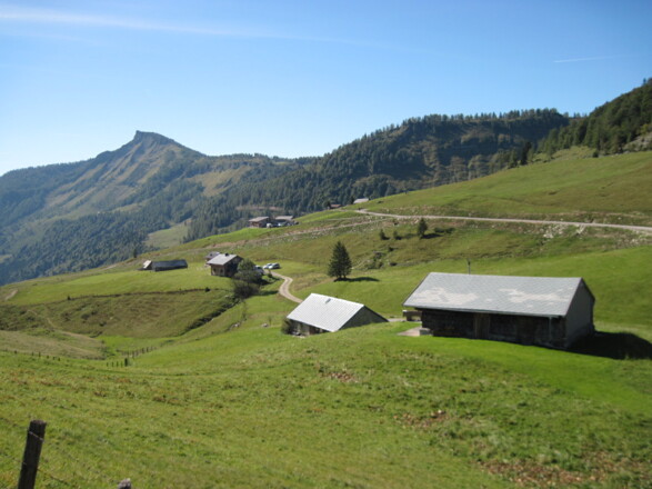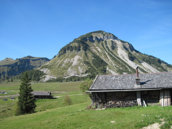 Vom dortigen Parkplatz wandern Sie auf der geschotterten Mautstraße zur Genneralm hinauf – einige ihrer Kehren lassen sich auf einem Pfad abkürzen. Wo sich der Wald zwischen dem Gennerhorn und der Felskuppe des Holzecks schließlich lichtet und Almwiesen Platz macht, erreichen Sie rechts die Hinter- und die Reithütte sowie links die Poschn’hütte auf der Genneralm (1.295 m). 1:30 h