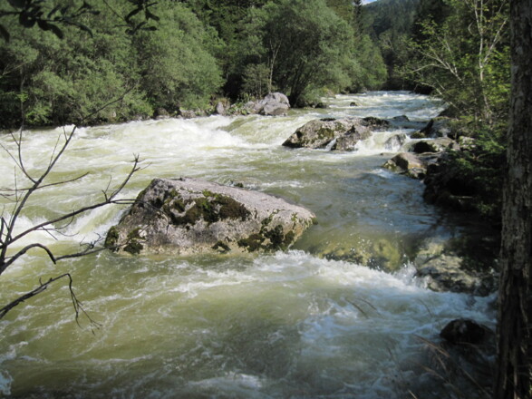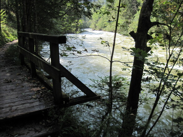 Auf der anderen Straßenseite finden Sie eine Infotafel über den Weg, der ins enge Koppental und zum beeindruckenden Felsportal der Koppenbrüllerhöhle führt (Be-sichtigung möglich, https://dachstein-salzkammergut.com). Davor gehen Sie links hinunter zur Koppentraun, die Sie bei der Eisenbahnbrücke und einer Hängebrücke für Fußgänger erreichen. Rechts weiter und durch einen Tunnel der alten Bahntrasse (die wegen der Hochwassergefahr höher hinaufverlegt wurde).