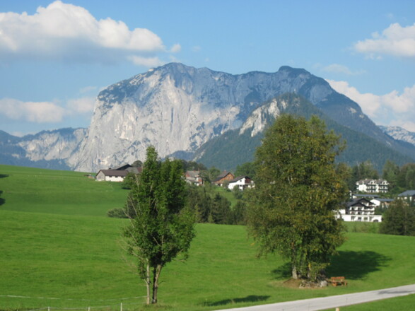 Bei der folgenden Gabelung bleiben Sie links neben der wild schäumenden Koppentraun und kommen an der Landesgrenze der Steiermark an einer Kapelle vorbei. Nach der gastlichen Schutzhütte Koppental passieren Sie einen großen Lawinenschutzdamm, der darauf hinweist, wie gefährlich dieses Gebiet im Winter ist. Bald danach gelangen Sie über eine weitere Hängebrücke auf die nördliche Talseite, über die der Weg in Kehren zu einer Forststraße ansteigt. Rechts erreichen Sie – schließlich auf Asphalt – die verstreuten Häuser der Ortschaft Sarstein (707 m). Bei den Abzweigungen nahe der Mostschenke Sarsteinrast bleiben Sie auf der Sarsteinstraße, die über Wiesen bis zur Sommersbergseestraße führt. Auf dieser links, am Hotel Wasnerin vorbei und danach rechts auf den bald geschotterten Roseggerweg abzweigen. Dort genießen Sie nun eine wunderbare Aussicht – vom Toten Gebirge mit dem burgartigen Loser und der Trisselwand über den Hohen Sarstein bis zum Hallstätter Gletscher am Hohen Dachstein. Nach einem Stadel zweigen Sie beim Wegweiser „Bad Aussee“ rechts zum Parkplatz vor dem Narzissen-Bad ab. Vorbei am benachbarten Hotel und dann rechts auf einem Wiesenweg zum (dauerhaft geschlossenen) Teichwirt.