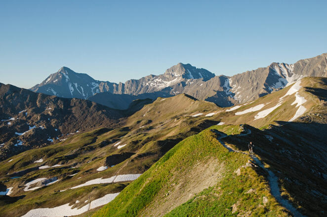 Lange Tour entlang des Grenzgrats zwischen der Schweiz und Österreich. Die Anstrengung wird mit grandiosen Ausblicken und einer langen Abfahrt aus Trails belohnt.